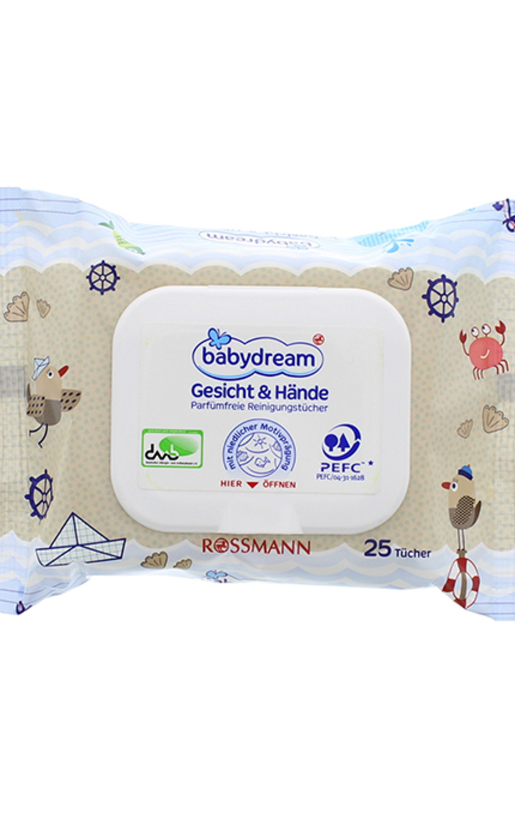 Attīrošas BabyDream Travel mitrās salvetes sejas un rokas salvetes bez spirta, smaržvielām un krāsvielām. Dermatoloģiski apstiprinātas un der arī jutīgai pieaugušo ādai. Vācijas Alerģijas un astmas asociācijas apstiprināta.