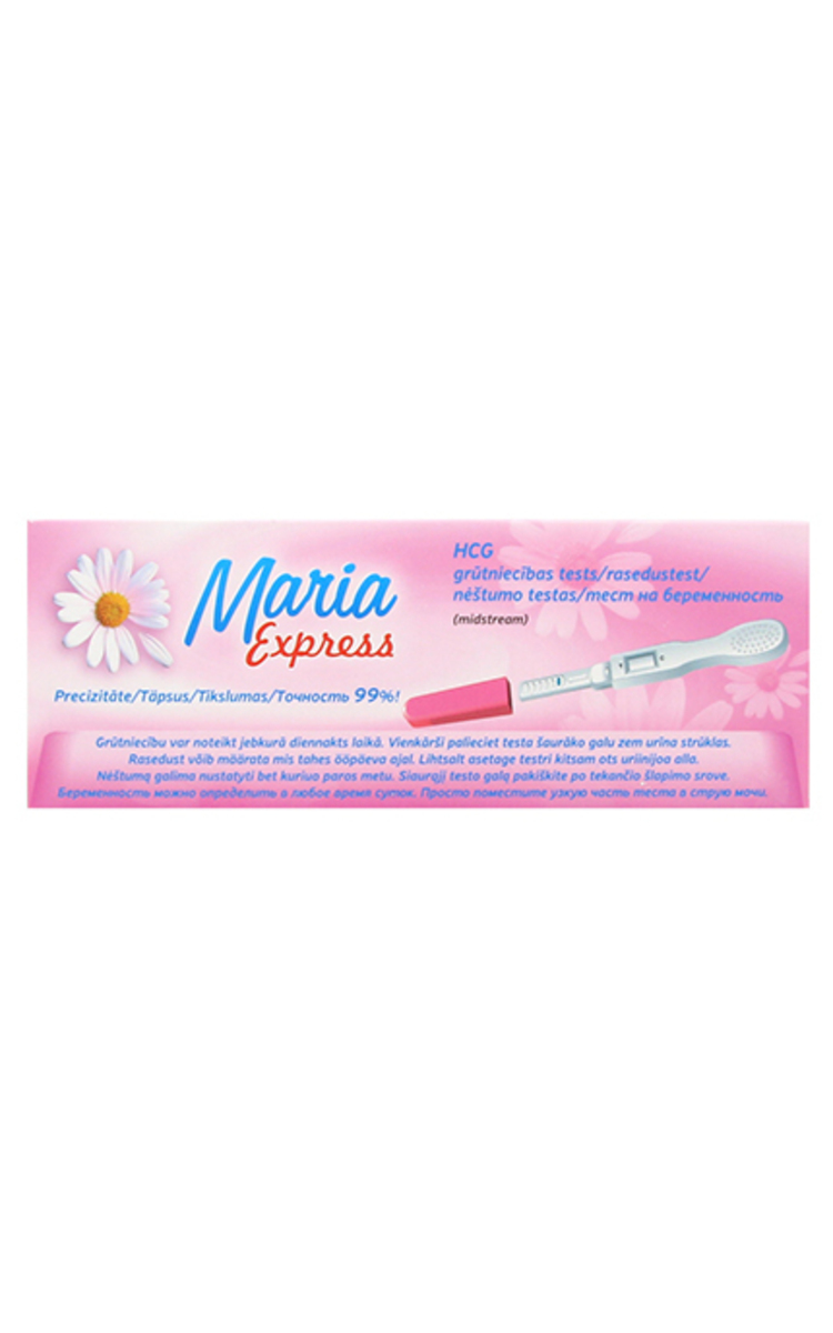 Maria Express grūtniecības tests ātrai un ērtai grūtniecības noteikšanai ar maksimālu precizitāti agrīnajā stadijā, sākot no pirmās dienas pēc gaidāmās menstruāciju datuma aizkavēšanās.