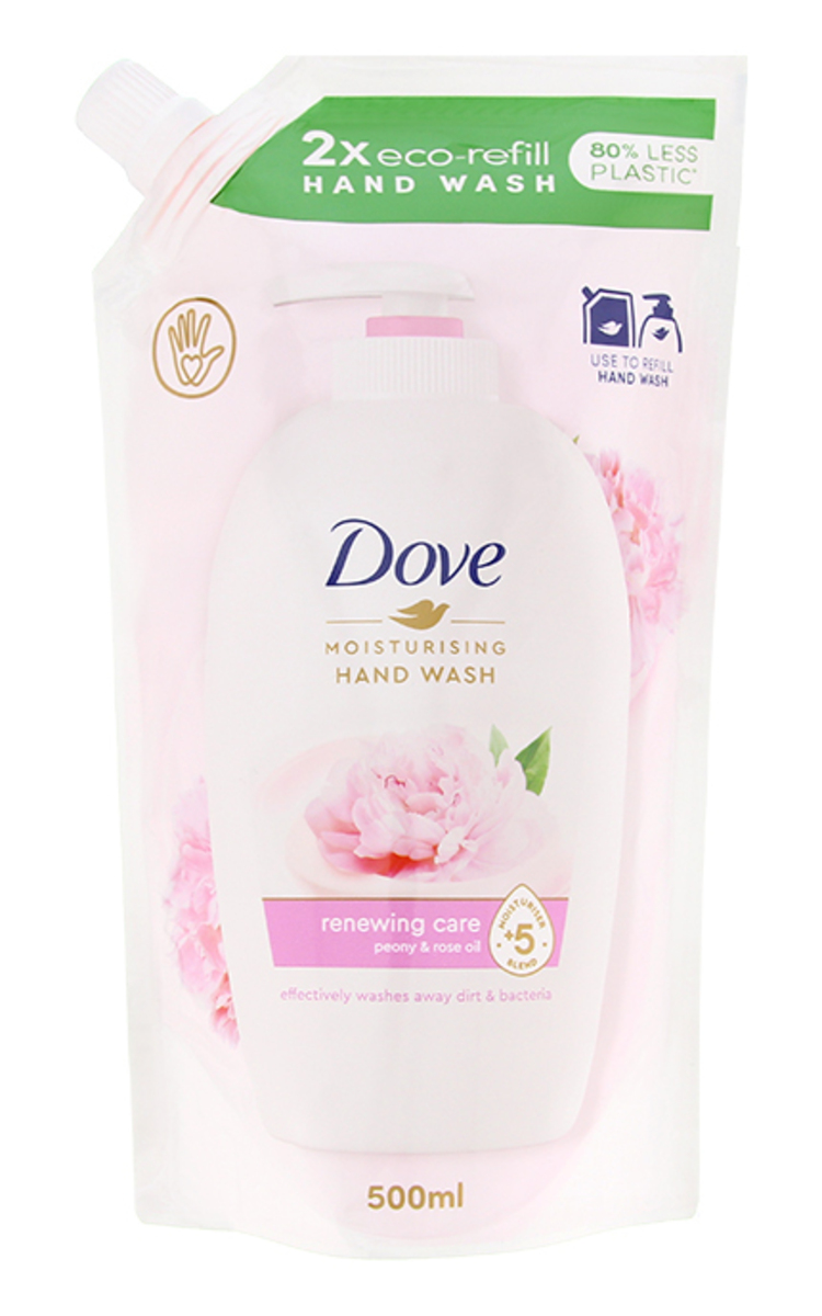 Dove Renewing Care Peony&Rose Oil šķidrās ziepes maigi un efektīvi attīra roku ādu no netīrumiem. Tā unikālā formula ar +5 mitrinošām sastāvdaļām baro un kopj roku ādu. Dove šķidrās ziepes attīra ādu dažu sekunžu laikā un baro to stundām ilgi. Jaunā formula ir 99% bioloģiski noārdāma, tāpēc tā rūpējas ne tikai par jūsu ādu, bet arī par apkārtējo vidi.
