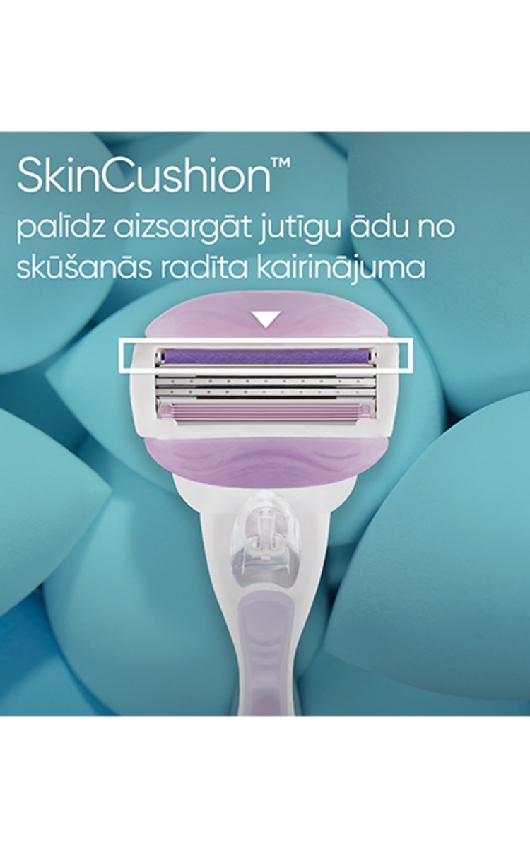 Kasetnēm ir trīs ķermeņa izliekumus aptveroši asmeņi ar aizsargājošiem spilventiņiem, kas nodrošina gludu, tīru skuvumu tikai ar vienu rokas kustību. Iestrādātā skūšanās želejas josla veido putas, tāpēc nav nepieciešams atsevišķais skūšanās līdzeklis.