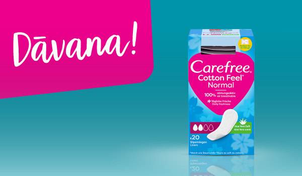Pērc 2 CAREFREE produktus un saņem dāvanu – CAREFREE Cotton Feel Normal Aloe ikdienas ieliktnīšus, 20 gab. *Izņemot CAREFREE Cotton Feel Normal Aloe ikdienas ieliktnīšus, 20 gab.
