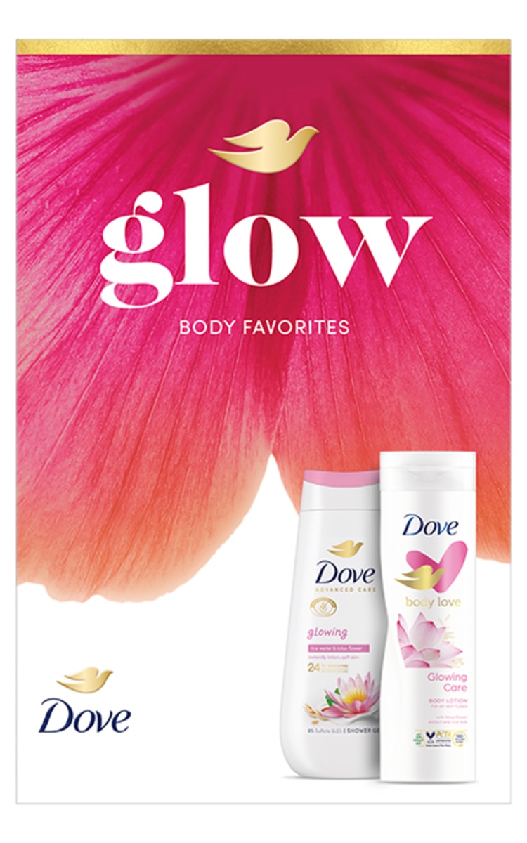 Dove Glowing Care ķermeņa losjons ir smalki sajaukts ar rīsu pienu un lotosa ziedu ekstraktu. Formula darbojas dziļākajos ādas slāņos, ne tikai mitrinot virsmu, bet arī sniedzot dziļu barošanu, lai iegūtu mirdzošu izskatu un zīdaini maigu sajūtu jebkuram ādas tipam.