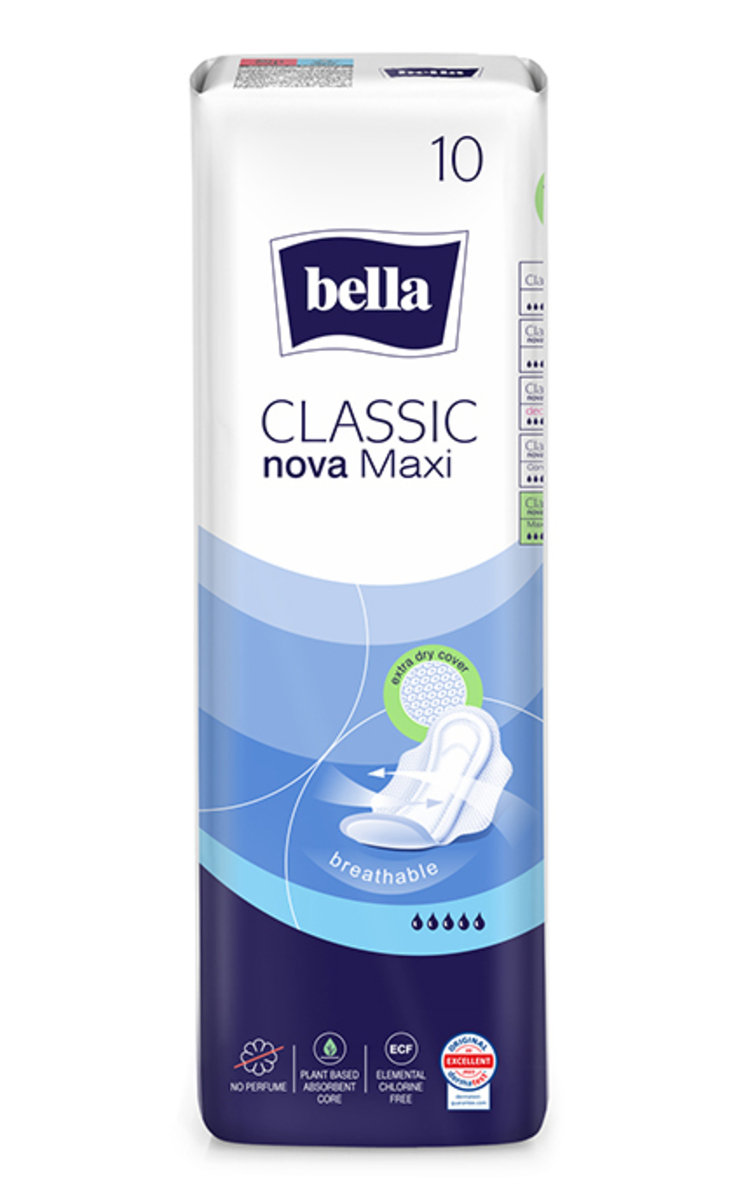 Pateicoties pagarinātai formai un īpaši augstajai uzsūktspējai, Bella Nova Maxi drain gaisu caurlaidīgās higiēniskās paketes ir īpaši piemērotas lietošanai naktī un intensīvu menstruāciju gadījumā.