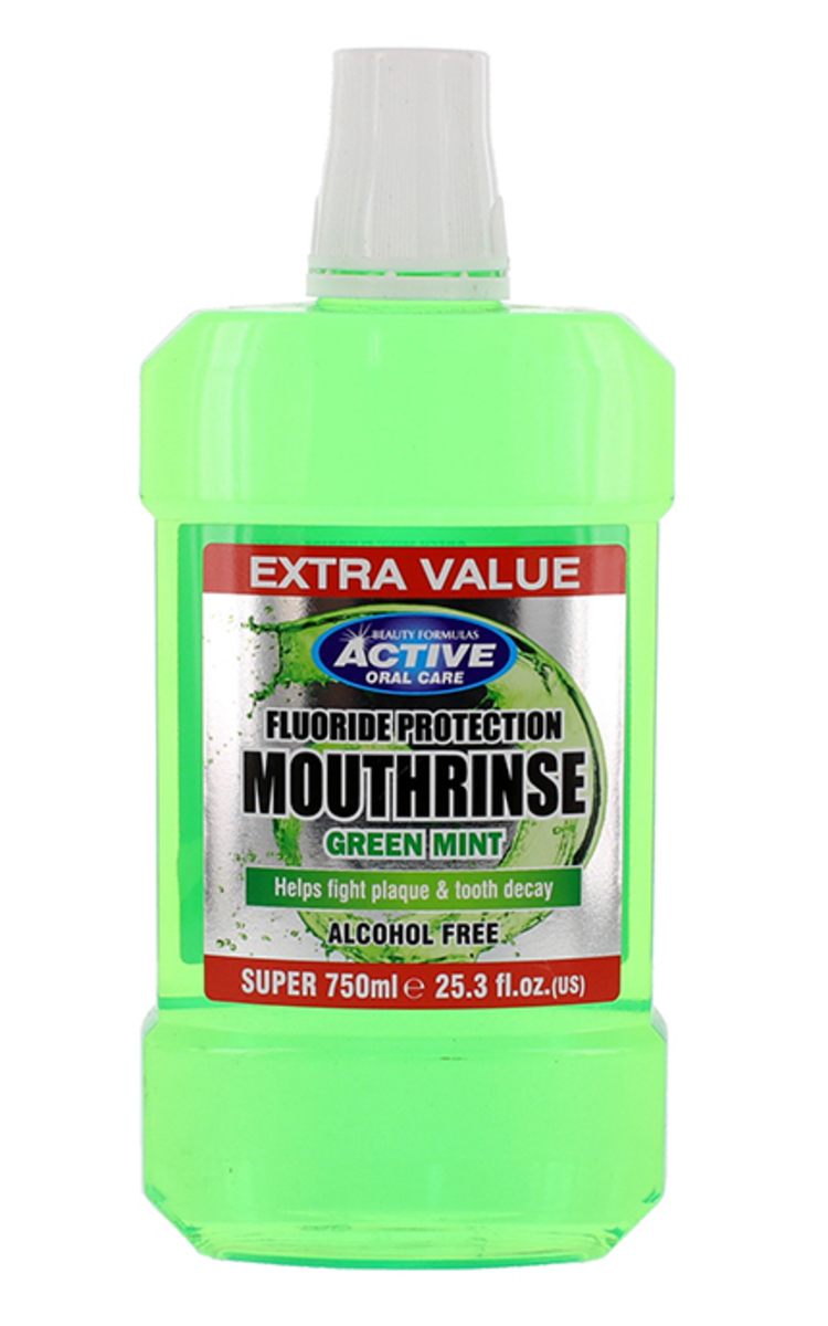 Fluoru saturošais Active Oral Care Green Mint mutes skalošanas līdzeklis palīdz cīnīties ar aplikumu un zobu bojāšanos, kā arī atsvaidzina elpu. Nesaudzīgs pret aplikumu, saudzīgs pret mutes gļotādu, jo nesatur alkoholu.