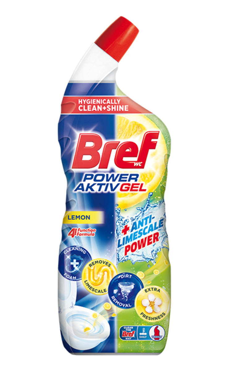 Tualetes tīrīšanas līdzeklis Bref Power Aktiv nodrošina lieliskus tīrīšanas rezultātus, spīdumu un svaigu citrona smaržu. Tas notīra kaļķakmens nogulsnes, netīrumus un traipus no tualetes poda malas un iekšpuses un uz ilgu laiku piepilda vannas istabu ar svaigu smaržu. Līdzeklis ir efektīvs pret visbiežāk sastopamajām problēmām tualetes podu tīrīšanā un nodrošina vieglu un ļoti higiēnisku uzkopšanu. To var izmantot kā ikdienas tīrīšanas līdzekli jebkuras formas tualetes podam un virsmām.