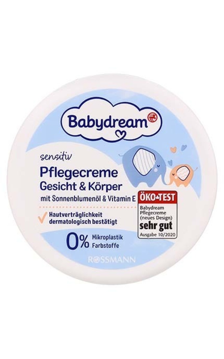 Kopjošais BabyDream maigs krēms bērniem ar saulespuķu eļļu un E vitamīnu sejas un ķermeņa mīkstināšanai un aizsardzībai. Nesatur krāsvielas un konservantus, minerāleļļu un parafīneļļu, dermatoloģiski apstiprināta un der arī jutīgai pieaugušo ādai.