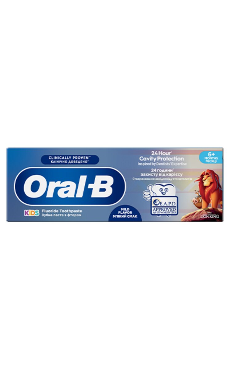 Oral-B Kids zobu pasta bērniem vecumā no 6 mēnešiem līdz 6 gadiem ar maigu augļu garšu. Tā ir klīniski pierādīta aizsardzība pret kariesu un satur 1000 ppm nātrija fluorīda. Zobu pasta nodrošina 24 stundu aizsardzību pret kariesu, lietojot to divreiz dienā, veido aizsargslāni pret cukuru un palīdz aizsargāt zobus no ikdienā lietotās pārtikas skābēm un cukuriem. Maigā formula īpaši izstrādāta bērniem un apstiprināta Bērnu zobārstniecības akadēmijā lietošanai no 6 mēnešu vecuma.