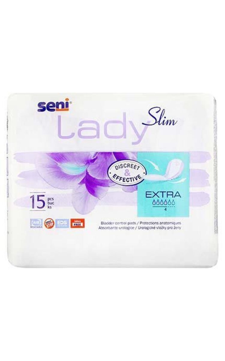 Seni Lady Slim Extra ieliktnīši efektīvi uzsūc nekontrolētas urīna noplūdes un neitralizē nepatīkamu aromātu. EDS sistēma veicina ātrāku un precīzāku mitruma sadalījumu visā izstrādājumā, savukārt hidrofobās sānu maliņas nodrošina maksimālu aizsardzību. Nesatur lateksu.