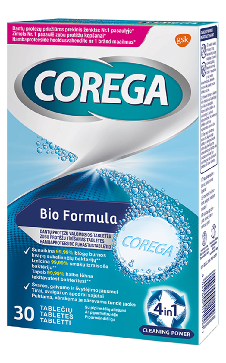 Ar Corega Bio zobu protēžu attīrošajām tabletēm Jūs saudzīgi un efektīvi attīrīsiet līdz pat 99,9% baktēriju Jūsu mutes dobuma veselībai un tīrībai!