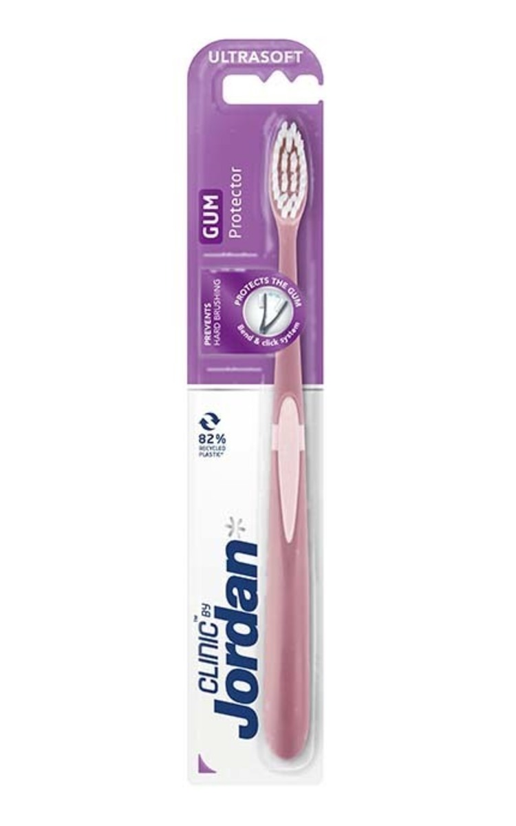 Jordan Clinic Gum Protector ultrasoft "atgriezeniskās saites" sistēmas zobu birste pareizai un maigai zobu un smaganu tīrīšanai.