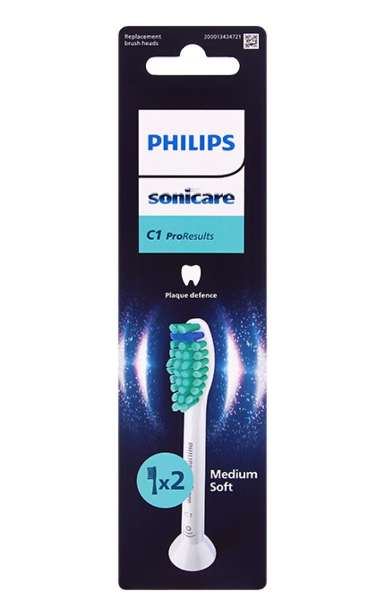 Elektriskās zobu birstes uzgaļi Philips Sonicare ProResults (balti). Uzgaļa īpašās formas sari un W veida profils ir veidoti, lai pielāgotos zobu formai un noņemtu līdz pat 2 reizēm vairāk aplikuma nekā parastā zobu birste.