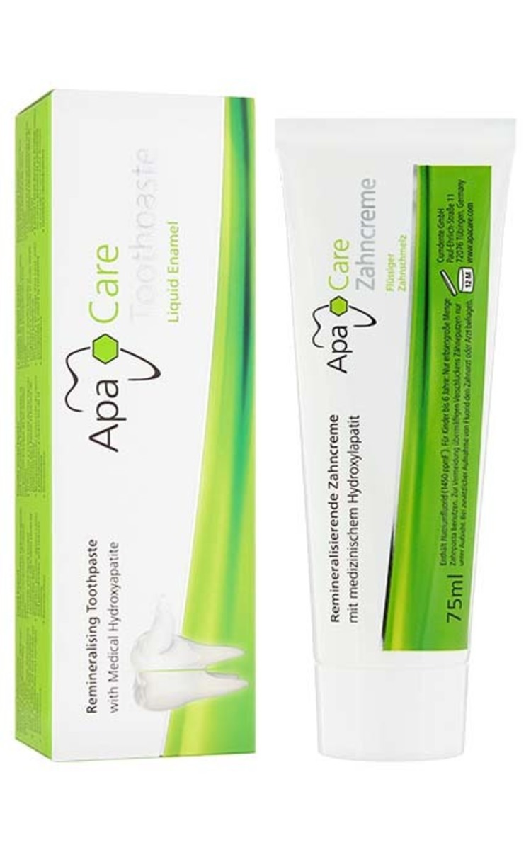 ApaCare zobu pastā ir ne tikai nātrija fluorīds (1450 ppm F-), bet arī šķidrā zobu emalja (hidroksilapatīts). Šo elementu kombinācija un citas rūpīgi atlasītas sastāvdaļas palīdz īpaši efektīvi ārstēt zobu emaljas bojājumus, mazināt zobu jutīgumu un sargāt tos no kariesa un periodontīta.