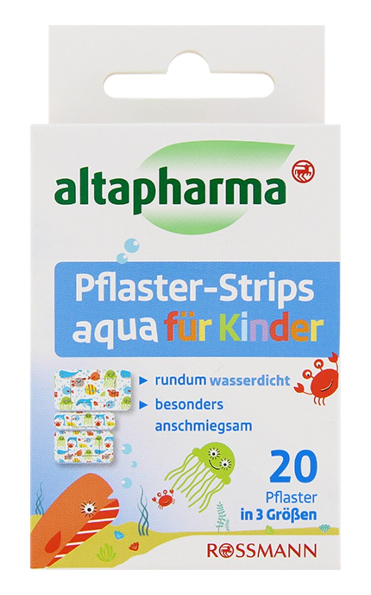 Altapharma jautrās, ūdensnecaurlaidīgās plāksteru loksnītes bērniem ir ideāli piemērotas virspusēju brūču aprūpei un aizsardzībai. Plānais, elastīgais materiāls pieguļ kā otra āda un aizsargā brūci no ūdens mazgāšanās, dušas un peldēšanās laikā. Plāksteri ir higiēniski iepakoti atsevišķi un nesatur lateksu. Trīs dažādu izmēru plāksteri, 8gab. (30x55mm), 8gab. (16x57mm) un 4gab. (38x72mm), piedāvā iespēju optimāli apstrādāt mazākas un lielākas brūces.