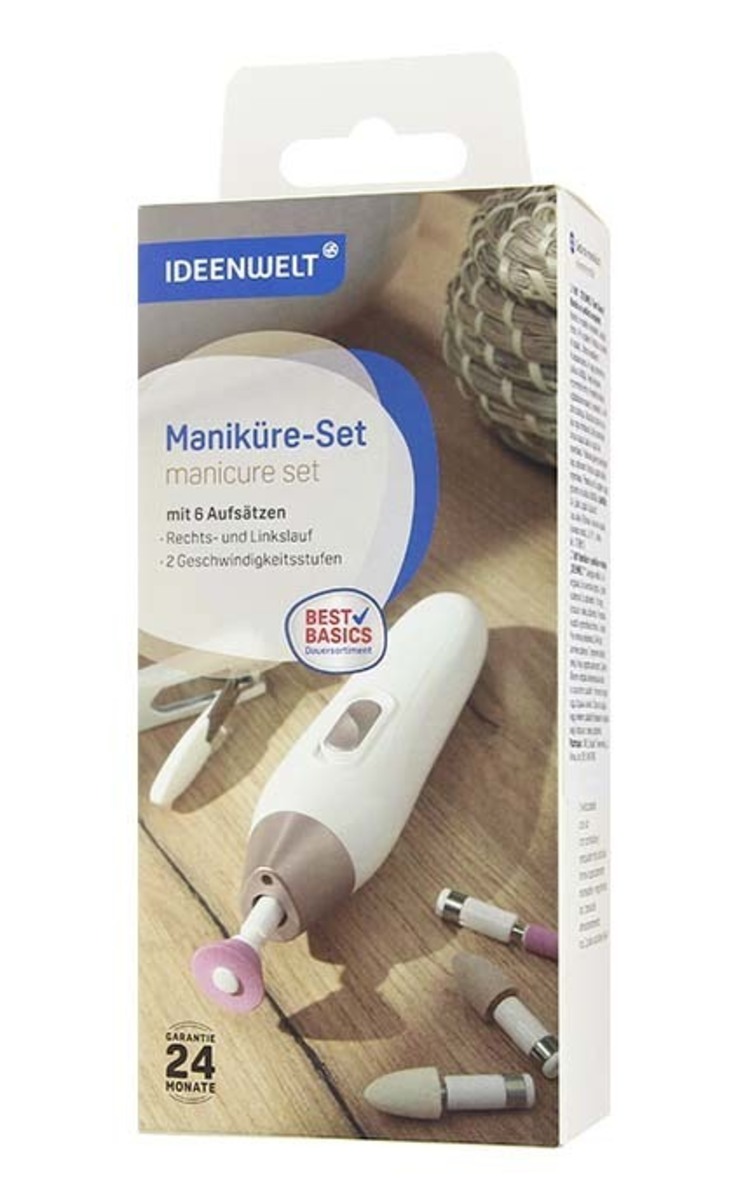 Daudzpusīgs pielietojums pateicoties 6 dažādiem uzgaļiem. Ideenwelt manikīra un pedikīra komplekts ne tikai griež un pulē roku un kāju nagus, bet arī noņem cieto ādu un kutikulas. Ierīcei ir 2 ātruma līmeņi ar rotāciju pulksteņrādītāja un pretēji, virzienā, īpaši parocīga un ergonomiska forma. Papildus 6 uzgaļiem komplektā ietilpst arī nagu knaiblītes, kutikulas atbīdītājs, praktisks uzglabāšanas maisiņš un 2 AAA baterijas.