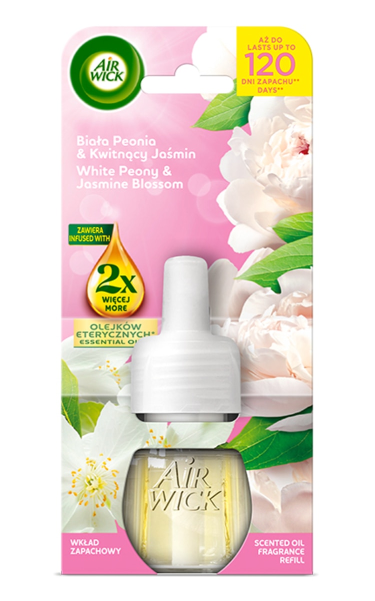 Elektriskā gaisa atsvaidzinātāja rezerves flakons ar baltās peonijas un jasmīna ziedu aromātu. Tas satur divreiz vairāk ēterisko eļļu* un nodrošina svaigumu līdz pat 120 dienām**.