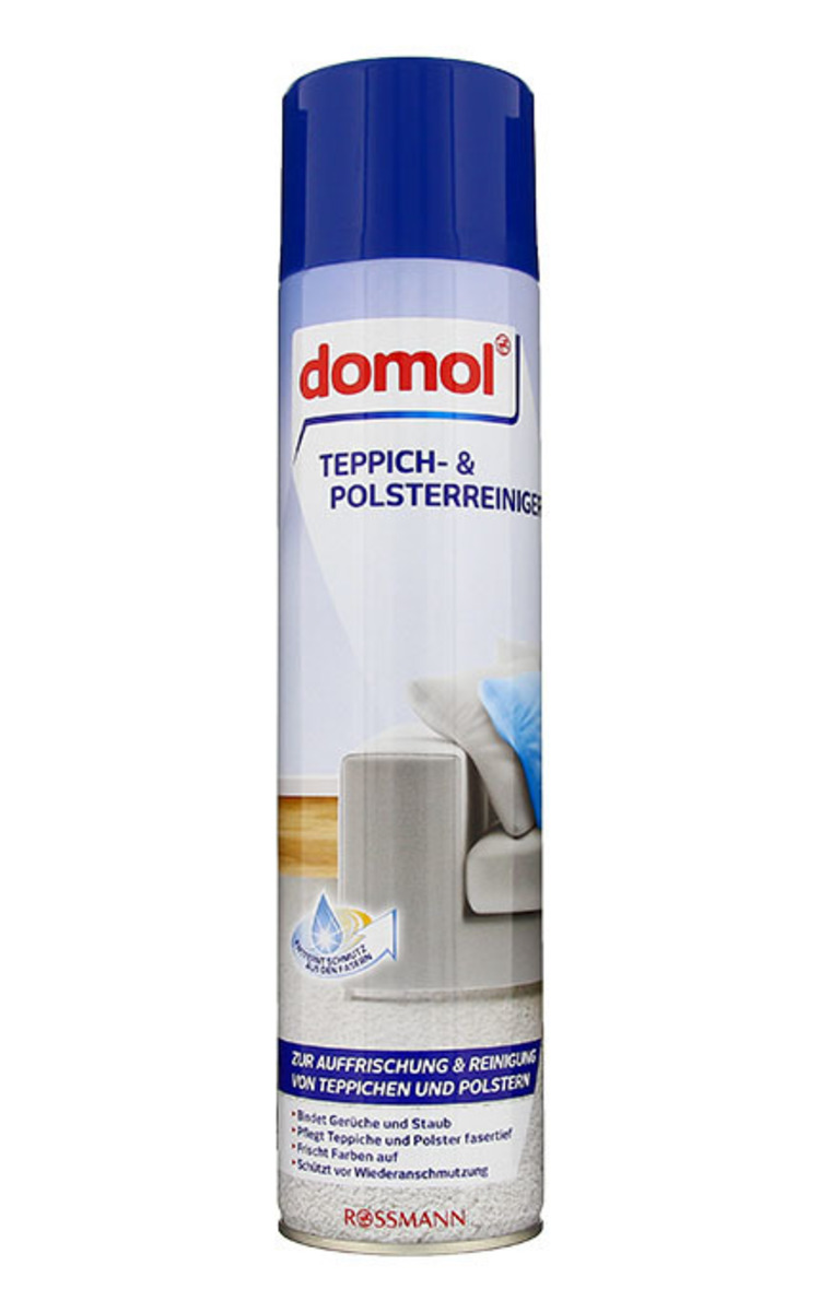 Tīrot paklājus un mēbeles ar Domol kopjošo līdzekli, tie ilgāk saglabāsies un izskatīsies kā jauni, saglabājot vai atjaunojot labu aromātu. Nosūciet virsmu ar putekļusūcēju. Flakonu pirms lietošanas un lietošanas laikā labi sakratiet. Vienmērīgi izsmidziniet līdzekli no 40–60 cm attāluma, pievēršot uzmanību tam, lai audums nebūtu izmircis pilnībā. Ierīvējiet putas ar mitru mīkstu suku vai sūkli visos virzienos. Ļaujiet putām iedarboties līdz pilnīgai izžūšanai (apmēram 1–2 stundas). Pamatīgi nosūciet paklāju vai polsterējumu ar putekļsūcēju un pēc nepieciešamības atkārtojiet procesu. Mērķtiecīgai traipu noņemšanai ieteicams speciāls traipu noņemšanas aerosols.