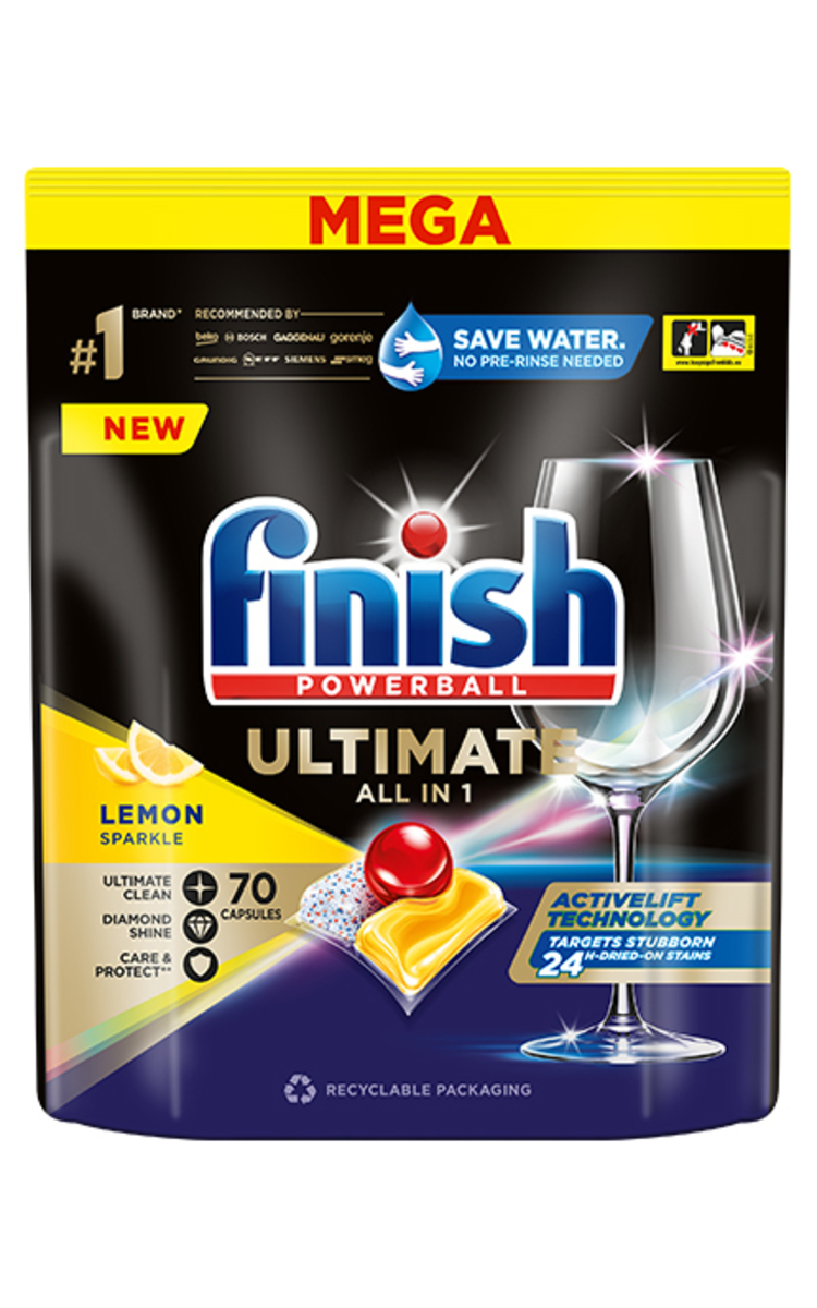 Finish Powerball Ultimate, kapsulas trauku mazgāšanas mašīnām, izcilai tīrībai un dimanta spīdumam katru dienu, sākot no pirmās lietošanas reizes, ar citrona aromātu. Uzlabotais sastāvs ar ACTIVELIFT tehnoloģiju efektīvi notīra visu veidu ēdiena paliekas, pat noturīgus 24 stundas piekaltušus traipus, bez iepriekšējas skalošanas. Kapsulas aizsargā un rūpējas** par jūsu stikla traukiem un galda piederumiem, saglabājot to spīdumu pēc katras mazgāšanas. Nepārspējams sniegums pat ar par 15% mazāk ķimikāliju pēc svara nekā Finish Power. Nav jāizsaiņo, ar ūdenī 100% šķīstošu, vidē sadalošos apvalku.