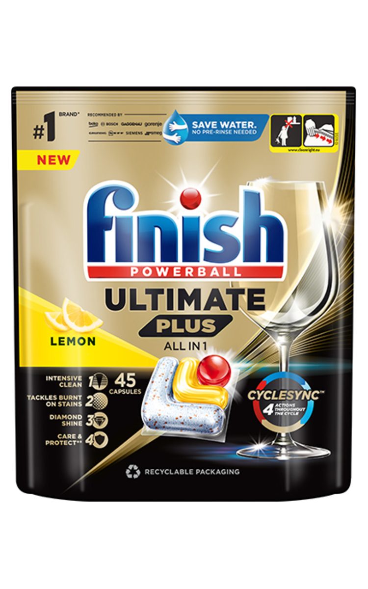 Finish Powerball Ultimate Plus, kapsulas trauku mazgāšanas mašīnām, ar citronu aromātu. Finish Ultimate Plus kapsulas nodrošina intensīvu mazgāšanu un dimanta mirdzumu katru reizi, sākot no pirmās lietošanas reizes. Tās ir pirmās kapsulas ar Cyclesync™ tehnoloģiju, kas atbrīvo pareizo sastāvdaļu*, lai tā iedarbotos īstajā laikā. Uzlabotais sastāvs cīnās pat ar piedegušām ēdiena paliekām bez iepriekšējas skalošanas, nodrošinot 4 darbības visā mazgāšanas ciklā. Kapsulas aizsargā un rūpējas par stikla traukiem un galda piederumiem, saglabājot to spīdumu pēc katras mazgāšanas. Revolucionārs sniegums ar vidēji par 15% mazāk ķīmiskām sastāvdaļām pēc svara, salīdzinot ar Finish Power tabletēm. Satur kopjošus līdzekļus, kas palīdz aizsargāt stikla traukus no korozijas un spodruma zuduma. Šis produkts neaizsargā no mehāniskiem bojājumiem un neatjauno jau bojātus priekšmetus.