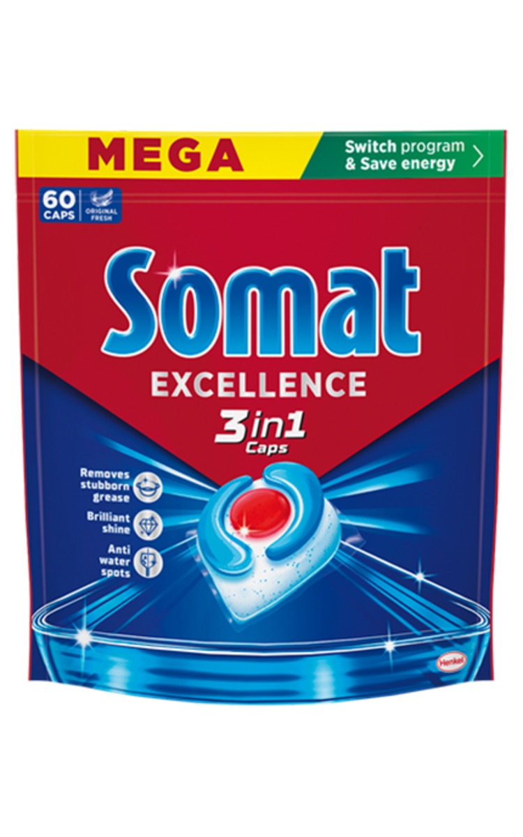 Somat Excellence 3in1 trauku mazgāšanas kapsulu formula apvieno trīs galvenās priekšrocības: noturīgu tauku noņemšanu, spīdumu bez ūdens nosēdumiem un aizsardzību pret koroziju delikātiem traukiem. Ātri šķīstošās augstākās kvalitātes kapsulas apvieno mazgāšanas pulveri un 3 cietā gela kameras, kas ietverts bioloģiski noārdāmā un 100 % ūdenī šķīstošā apvalkā.