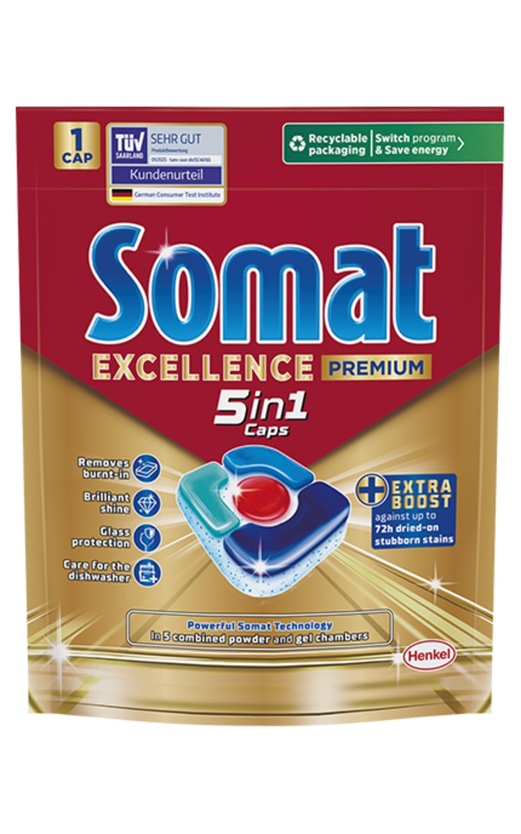 Somat Excellence 5in1 trauku mašīnas kapsulas ir īpaši paredzētas īsiem cikliem un zemas temperatūras eko cikliem.