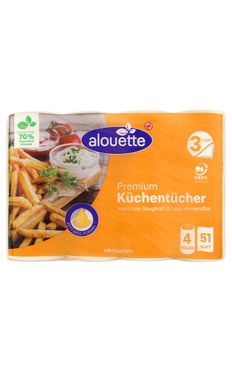 Alouette Premium augstas kvalitātes papīra dvieļi ir paredzēti ikdienas mājas darbiem – tīrīšanai, uzslaucīšanai, gatavošanai un virtuves virsmu kopšanai. Tie ir 3 kārtās, nodrošinot maksimālu uzsūktspēju, kā arī saglabā izcilu izturību pat tad, kad tiek lietoti mitri.