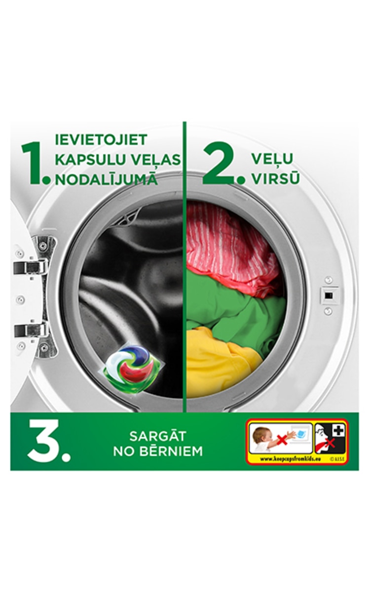 Veļas mazgāšanas kapsulas īpaši efektīvai traipu tīrīšanai. Kapsulas likvidē pat 7 dienu laikā iestāvējušos traipus un nepatīkamus aromātus. Tās ir izstrādātas tā, lai iedarbotos pat aukstākos ciklos, ātri izšķīstot aukstā ūdenī un nodrošinot nevainojamus rezultātus.