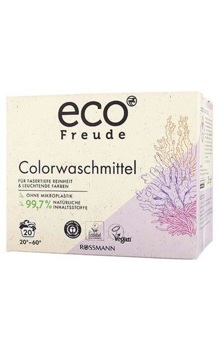 Eco Freude veļas pulveris krāsainam apģērbam, 20 mazgāšanas reizēm. Veļas mazgāšanas līdzeklis, kas ražots no 99,7% dabīgās sastāvdaļām, piemērots veļas mazgāšanai no 20°C līdz 60°C temperatūrā. Tas lieliski izmazgā drēbes pat zemā temperatūrā, saglabājot auduma krāsas.