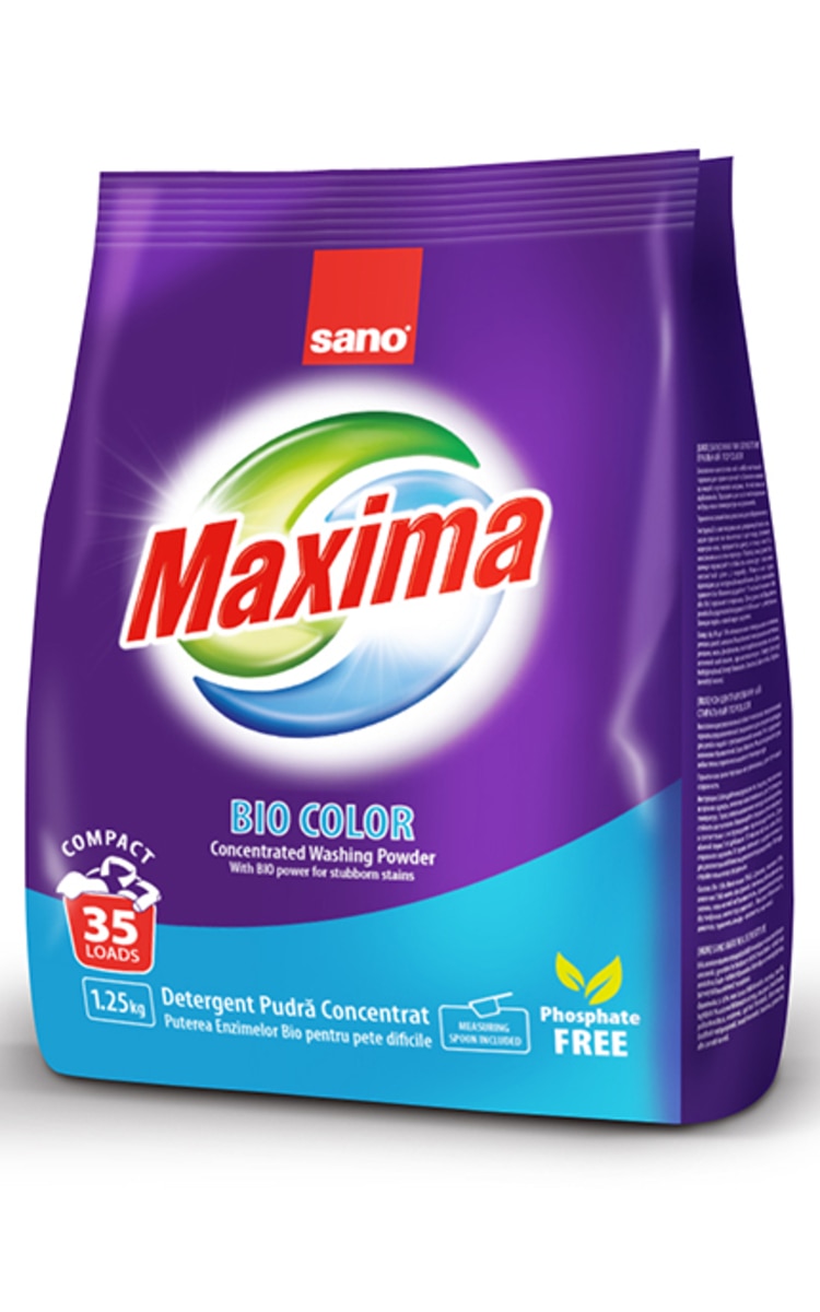 Koncentrēts veļas mazgāšanas pulveris, kas ideāli piemērots drēbju mazgāšanai īpaši zemajās temperatūrās. Sano Maxima mazgāšanas pulveri tiek ražoti, izmantojot vismodernākās tehnoloģijas, lai nodrošinātu efektīvu pārtikas un citu traipu likvidēšanu. Pulvera sastāvā iekļautie traipu noņemšanas komponenti pasargā šķiedras un krāsvielas, īpaši piemēroti cietajam ūdenim. Piemērots visu veidu audumiem un veļas mašīnām.