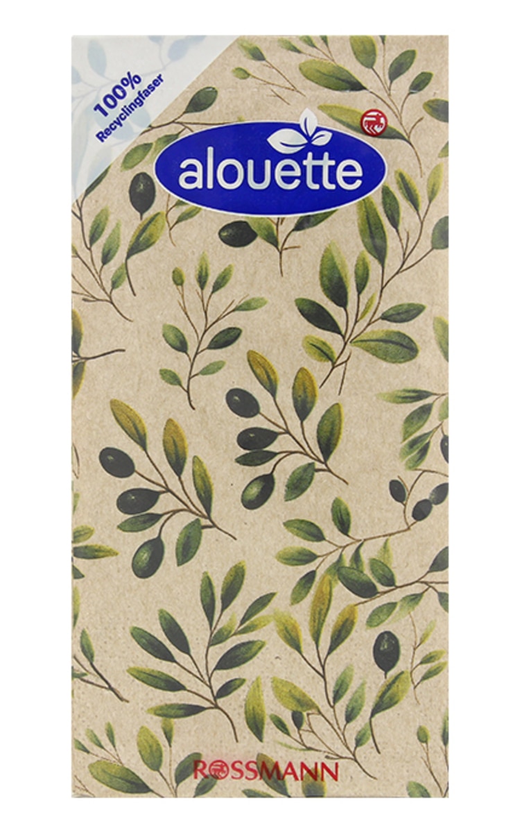 Augstas izturības Alouette salvetes ar olīvu motīvu galda servēšanai. Trīs slāņu papīra salvetes notīra, absorbē mitrumu, sakopj sausos netīrumus, ir izturīgas un mīkstas. Iepakojumā 16 salvetes.