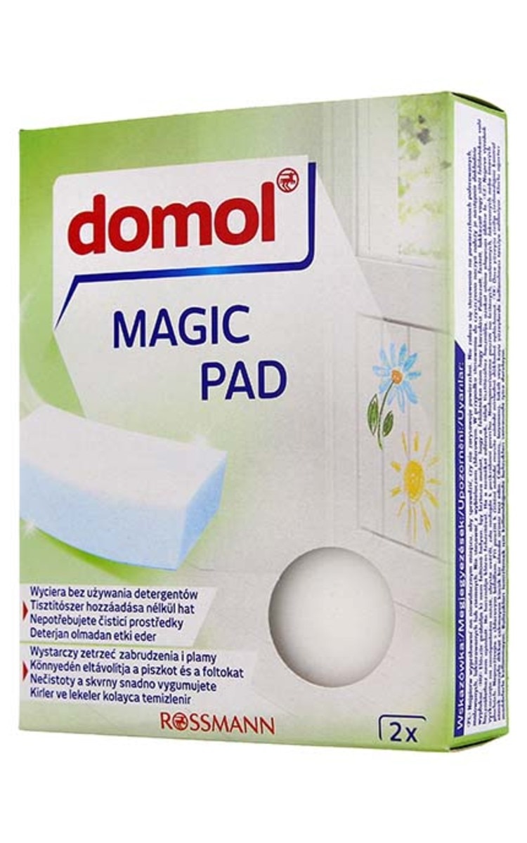 Губка Domol Magic Pad просто, но основательно чистит всевозможные пятна и загрязнения с различных поверхностей: нежелательные полосы и следы на белых обоях, красящих обоях, на полах, стенах, в ванной комнате, на кухне, на кухонных устройствах, холодильниках, на нержавеющих стальных раковинах, дачной мебели, салонах автомобилей, колёсных дисков, кожанной обивки, спортивной обуви и т.д. Увлажните губку небольшим количеством воды, выжмите и легко натирайте поверхность.