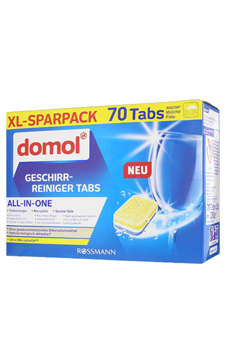 Domol таблетки для посудомоечной машины объединяют все важнейшие функции в одном продукте. Благодаря особой технологии, таблетки гарантируют мощное мытьё, защищают материал посуды, придают блеск. Таблетки смывают даже засохшие остатки пищи, нейтрализуют неприятный запах в стиральной машине, предотвращают пятна воды и извести, защищают машину от известкового налёта, стекло от коррозии, легко растворяют жир. Подходят для использования в коротких программах и при низких температурах (от 40 градусов). Не подходят для мытья расписанных вручную предметов, свинцовых кристаллов, посуды из алюминия, дерева и столовых приборов с деревянными ручками. Нержавеющая сталь не должна соприкасаться с серебром. Стаканы, стукающиеся друг о друга во время мытья, могут быть испорчены.