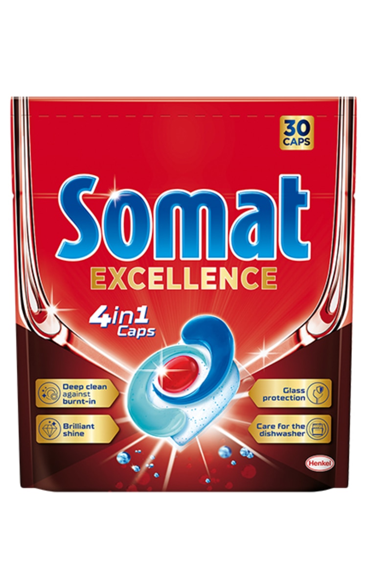 Капсулы Somat Excellence 4in1 имеют четыре преимущества: глубокая очистка с удалением пригоревших остатков пищи и застывшего жира, безупречный блеск без разводов и пятен, защита деликатной посуды от коррозии и уход за посудомоечной машиной. Быстрорастворимые капсулы премиум-класса для посудомоечной машины содержат порошкообразное моющее средство и 3 типа твёрдого геля в биоразлагаемой и полностью растворимой оболочке. Капсулы Somat Excellence 4in1 содержат высокоэффективный фермент, способный быстро растворять трудноудаляемые остатки пригоревших продуктов, жир и стойкие пятна даже в низкотемпературном экорежиме. Капсулы Somat подходят для всех тарелок, стаканов, кружек, бутылок, кастрюль, пластиковых контейнеров и сковород, которые можно мыть в посудомоечной машине. Высококачественное моющее средство для посудомоечных машин 4in1 не оставляет разводов и пятен, а значит, нет необходимости в повторной мойке или протирании после мытья в посудомоечной машине. Сверкающая чистотой посуда после каждого цикла мойки!
