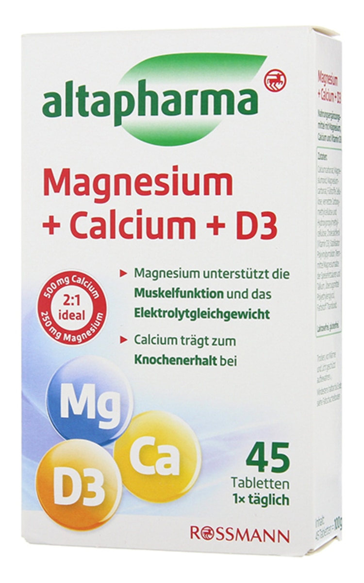 Магний и кальций являются жизненно необходимыми минеральными веществами, получение которых только лишь посредством пищи не всегда бывает достаточным. Магний - это незаменимый помощник в регулировании процесса обмена веществ, укреплении сердечно-сосудистой системы и уменьшению негативного влияния стресса. Кальций обладает свойствами, укрепляющим и восстанавливающими зубы и кости, а витамин D3 помогает организму создавать резерв кальция. В пищевой добавке Altapharma соеденены эти ценные компоненты, чтобы обеспечить организм дневной дозой витаминов. В упаковке 45 таблеток.
