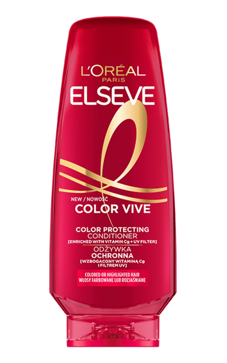 Color Vive кондиционер с УФ-фильтром. После окрашивания интенсивность цвета исчезает слишком быстро, потому что со временем незащищенный цвет быстро тускнеет и меняет оттенок. Линия защиты цвета Elseve Color Vive сохраняет интенсивность цвета до 40 стирок*. Формула, обогащенная витамином Cg и УФ-фильтром, сохраняет яркость цвета и помогает защитить волосы от внешних факторов.